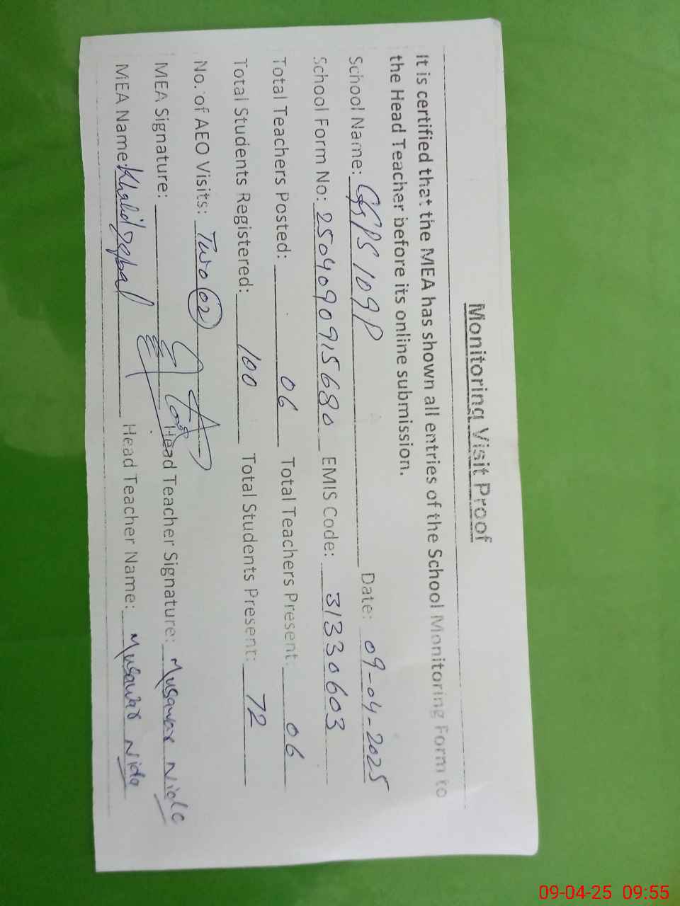 | Attendance Register | Head Teacher | MEA with School | Visit Proof |