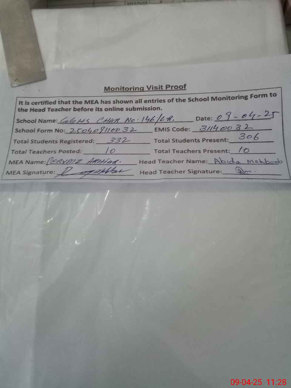 | Attendance Register | Head Teacher | MEA with School | Visit Proof |
