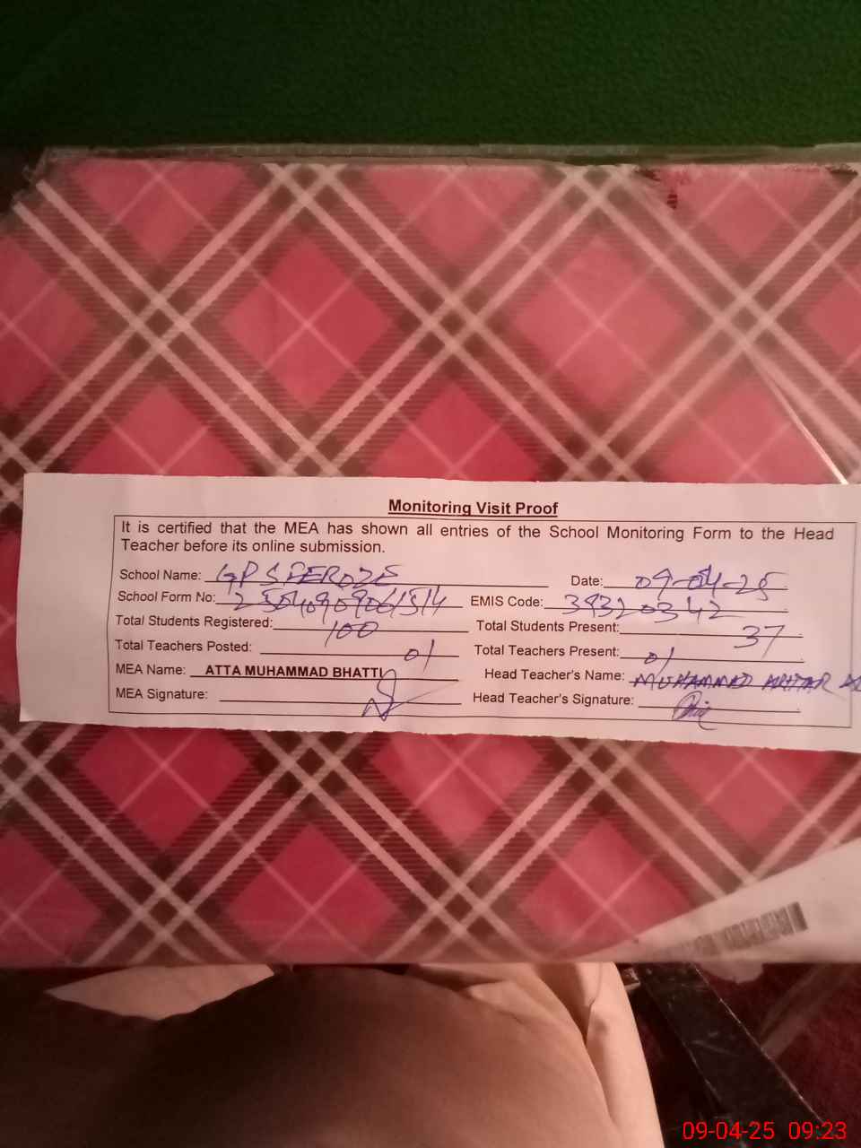 | Attendance Register | Head Teacher | MEA with School | Visit Proof |
