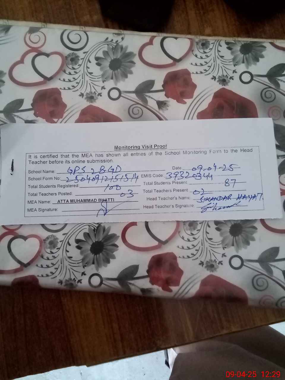 | Attendance Register | Head Teacher | MEA with School | Visit Proof |