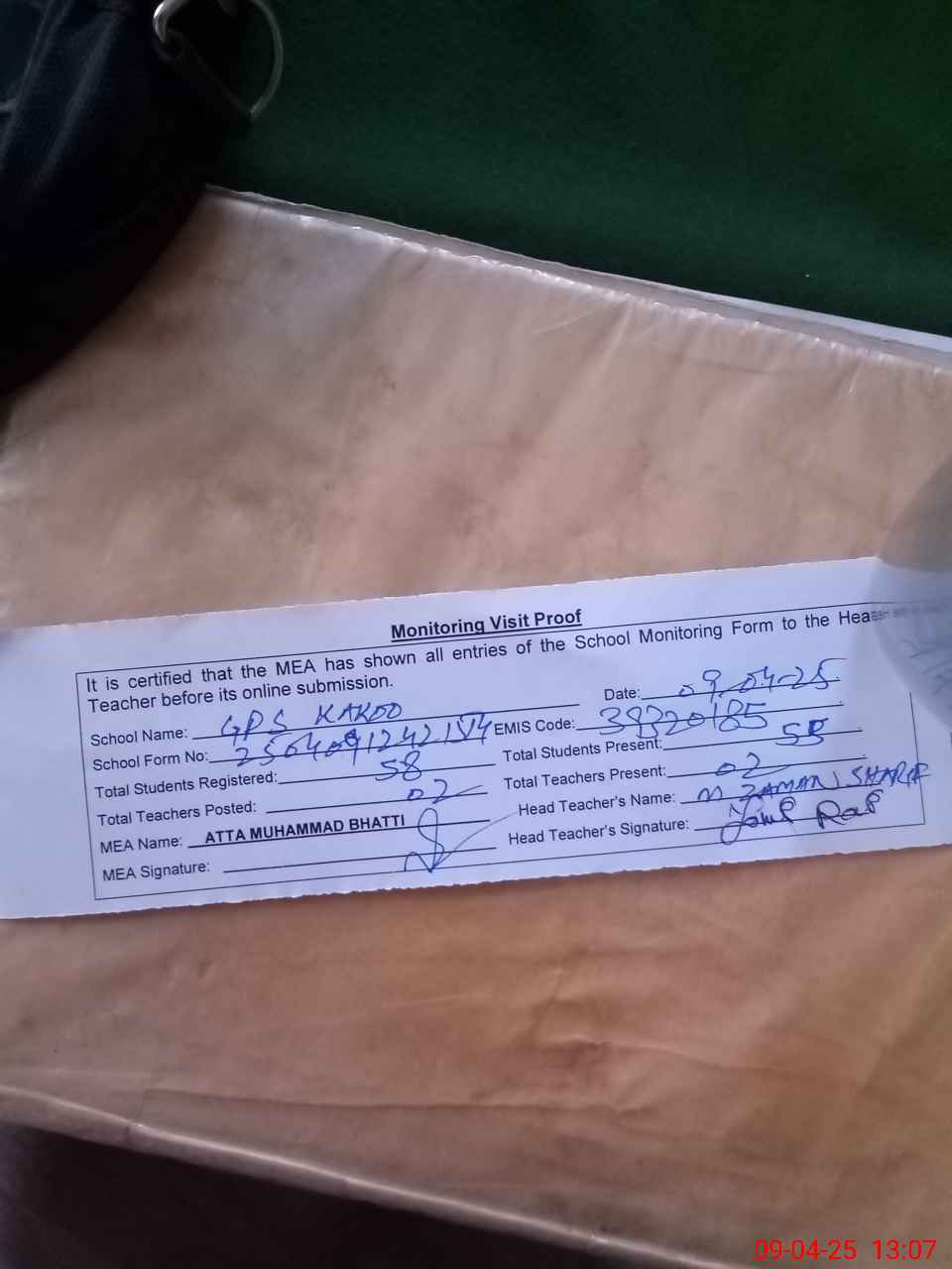 | Attendance Register | Head Teacher | MEA with School | Visit Proof |