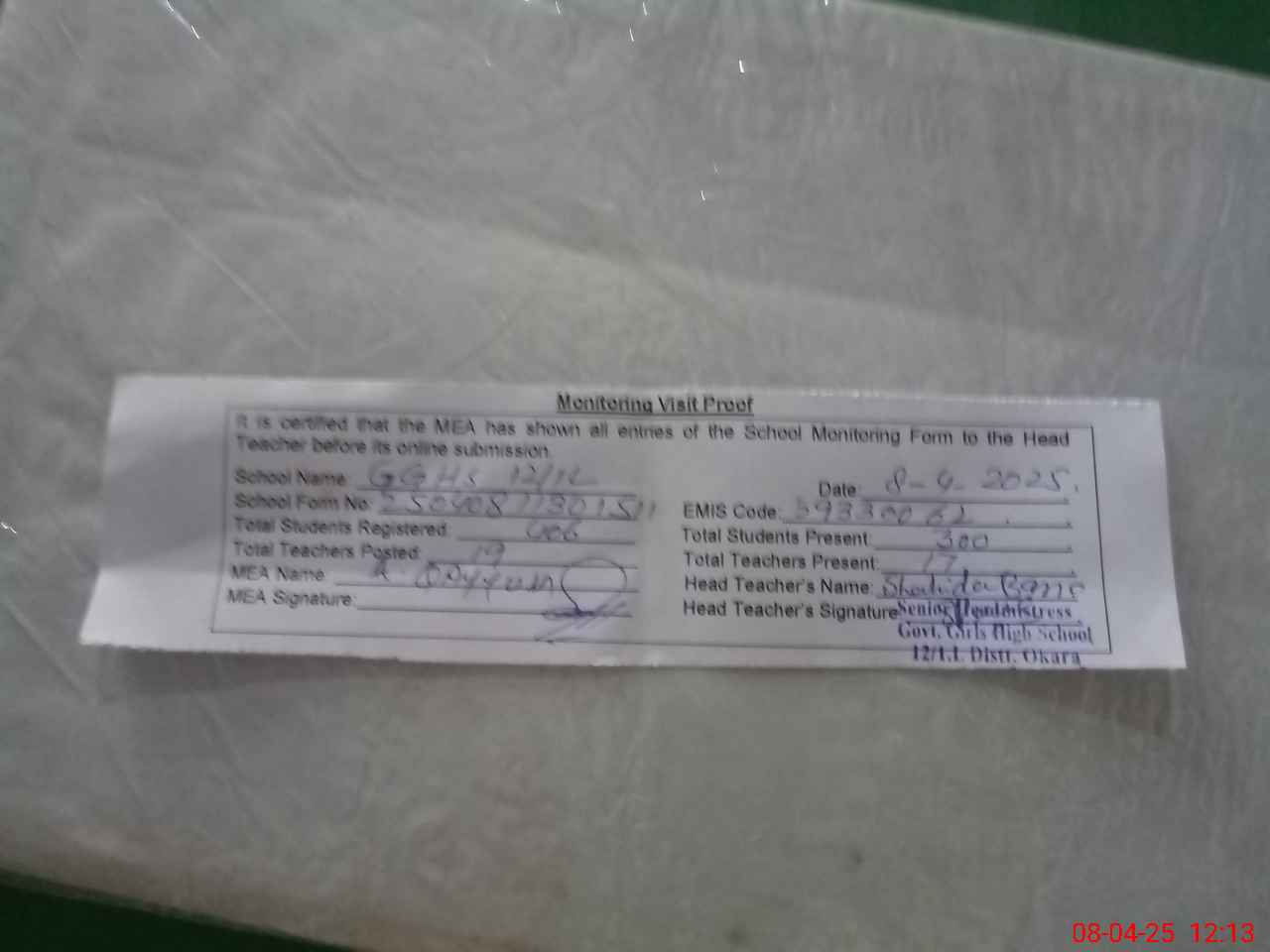 | Attendance Register | Head Teacher | MEA with School | Visit Proof |