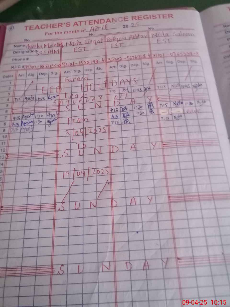 | CNIC | Full Name | Designation | R/C | Absence During Last Calender Month |
