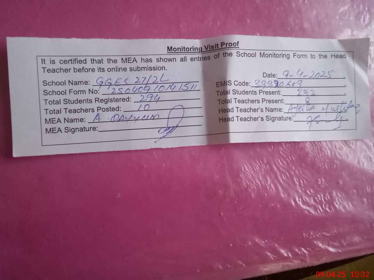 | Attendance Register | Head Teacher | MEA with School | Visit Proof |