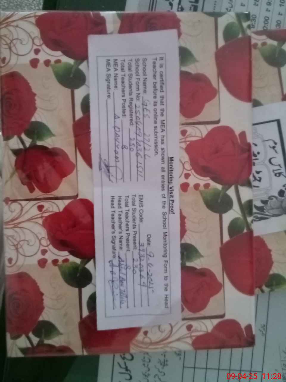 | Attendance Register | Head Teacher | MEA with School | Visit Proof |