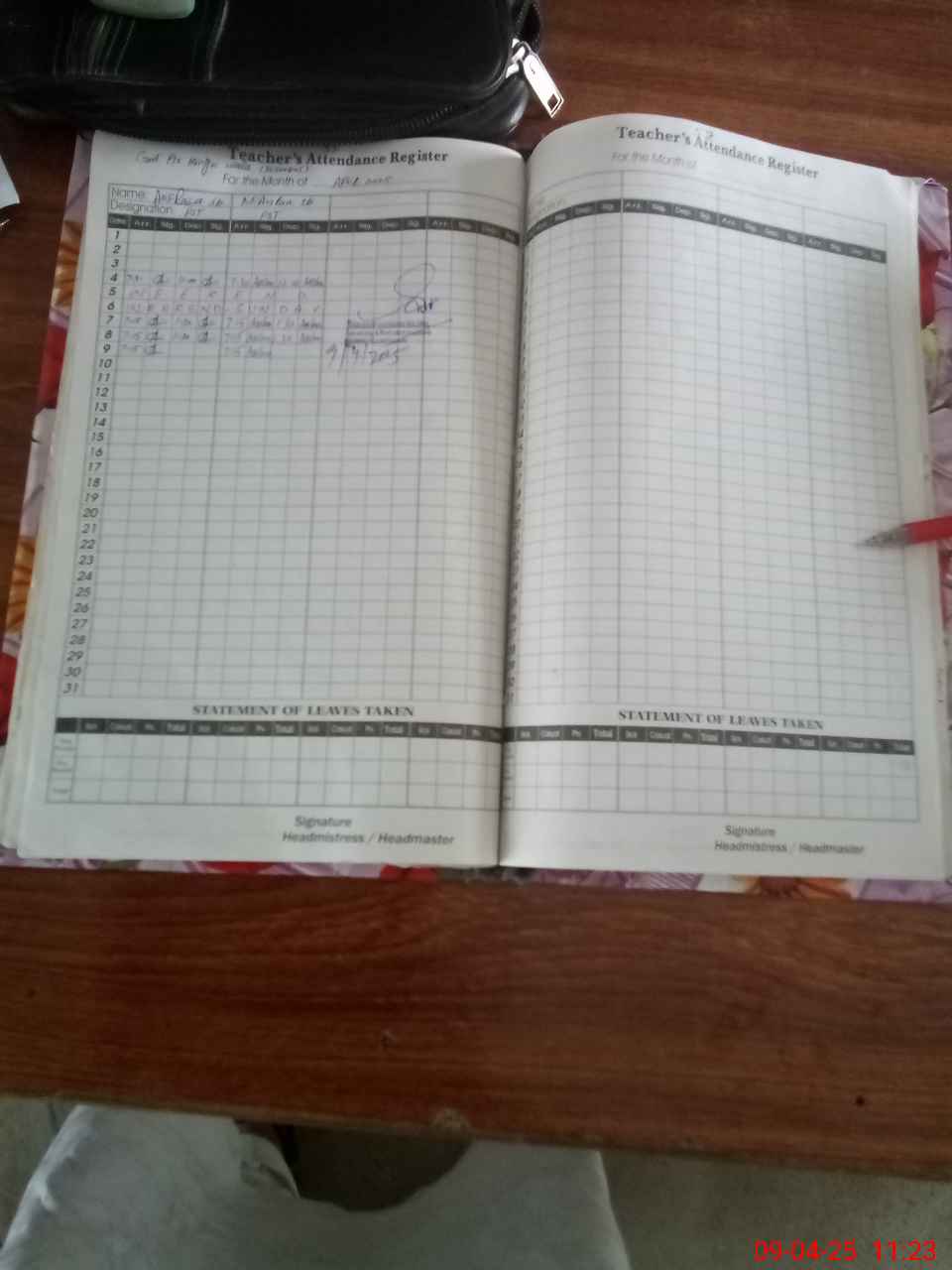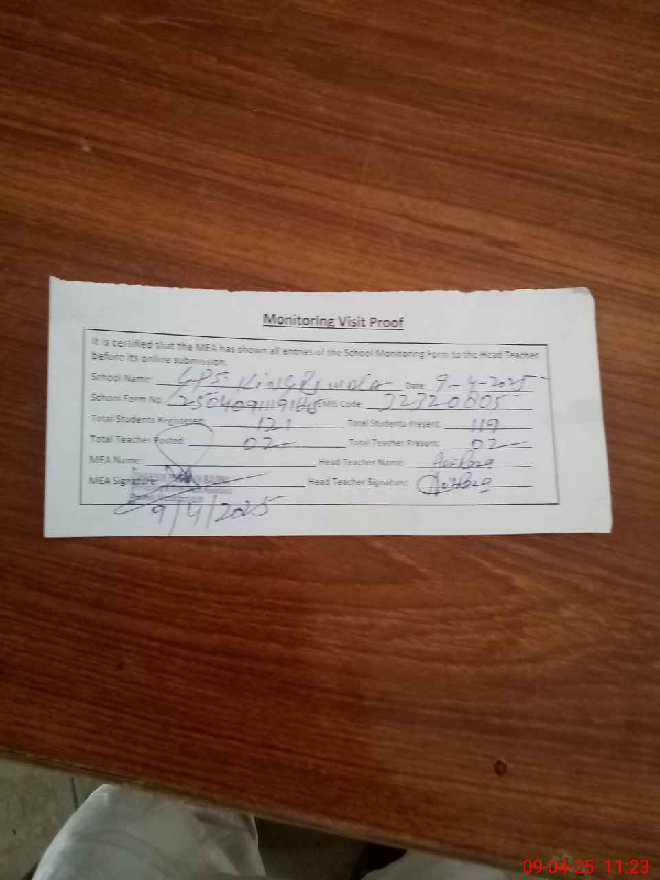 | Attendance Register | Head Teacher | MEA with School | Visit Proof |