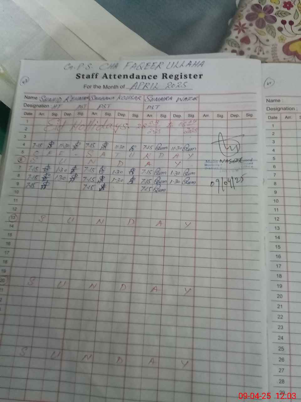 | Monitoring Date: 09-04-2025 | Start Time: 09-04-2025 11:36 AM | End Time: 09-04-2025 12:05 PM | Name of MEA: Na**** Ah**** | |