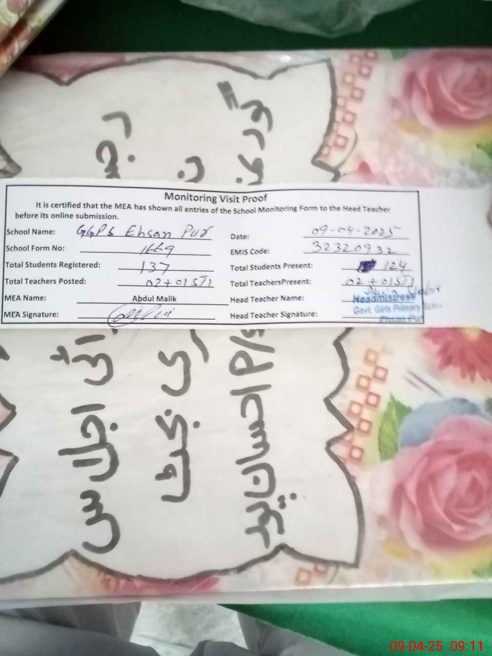 | Attendance Register | Head Teacher | MEA with School | Visit Proof |