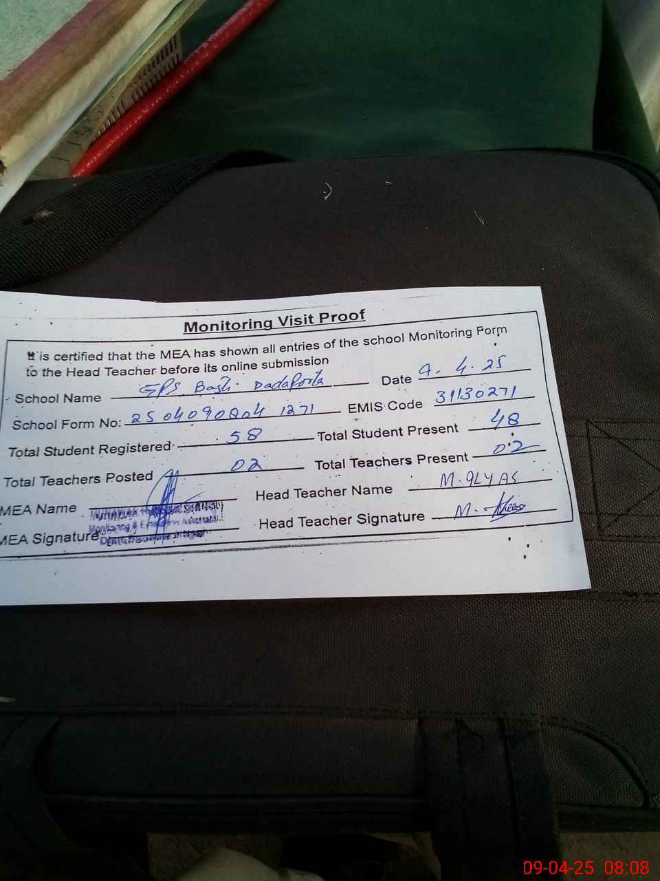 | Attendance Register | Head Teacher | MEA with School | Visit Proof |