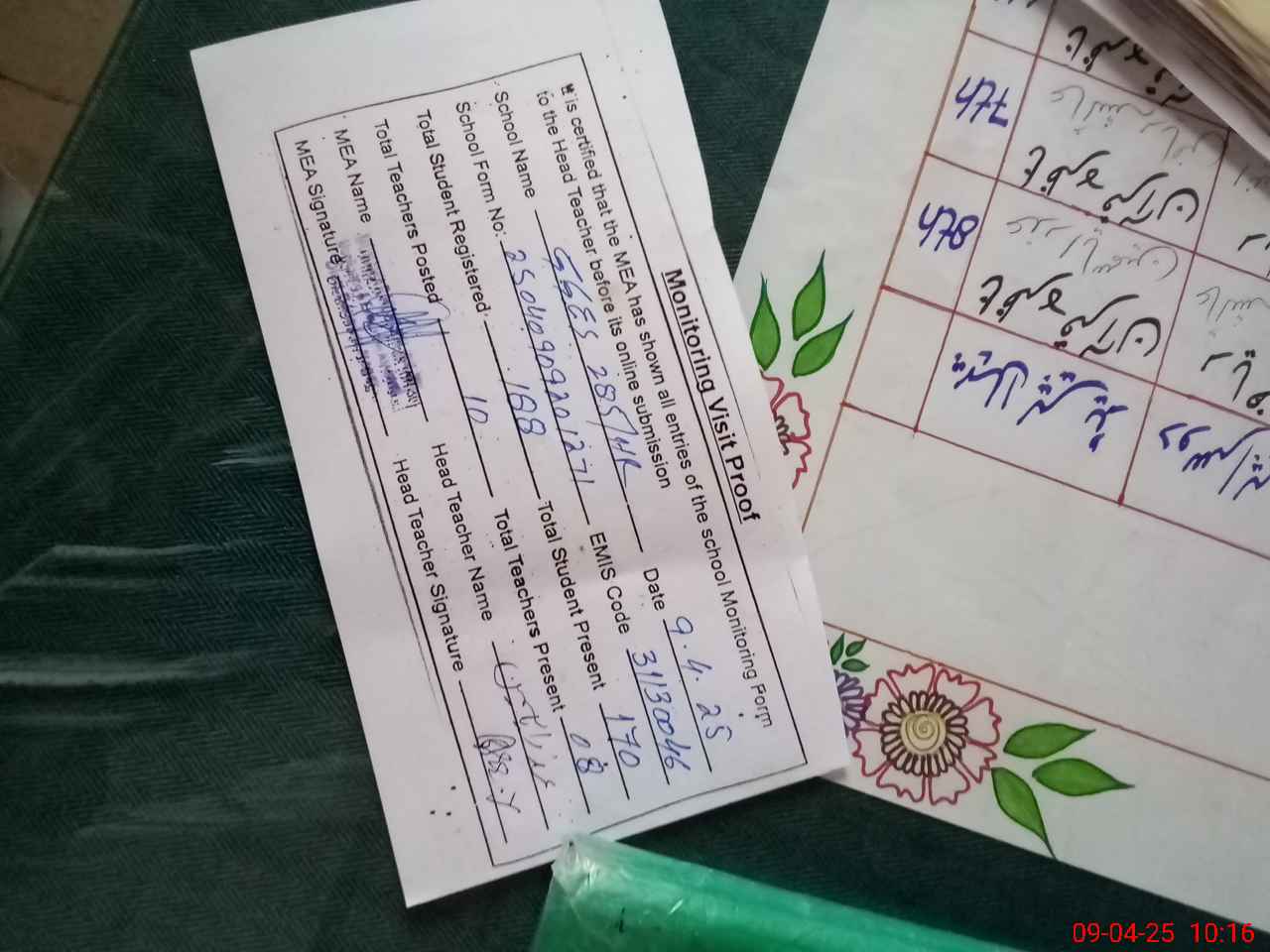 | Attendance Register | Head Teacher | MEA with School | Visit Proof |