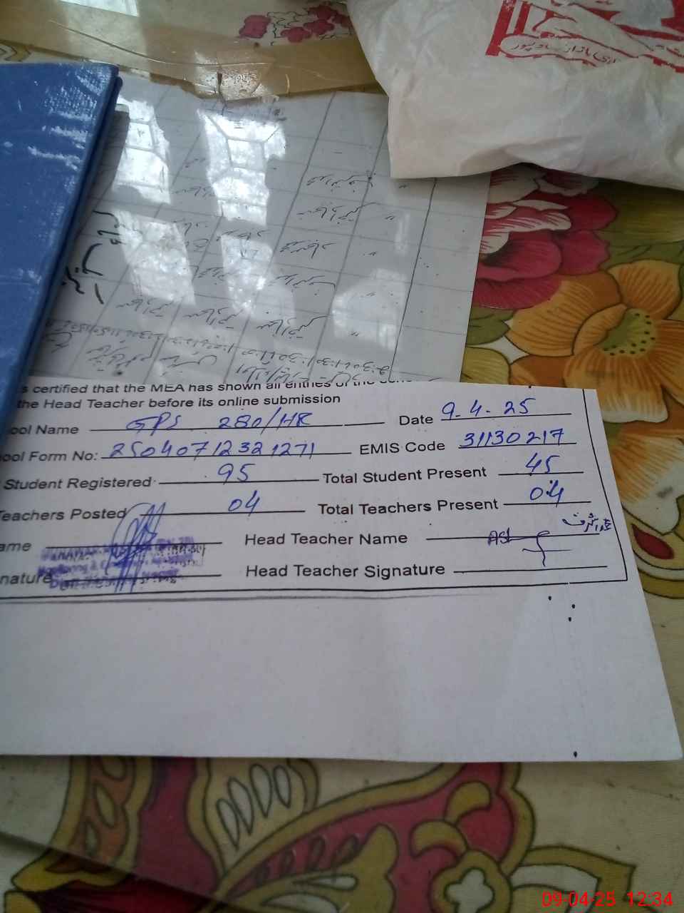 | Name: M.**** Designation: (School Headmaster's/Headmistress's) PTC/JV Phone/Cell Number: 03**** |