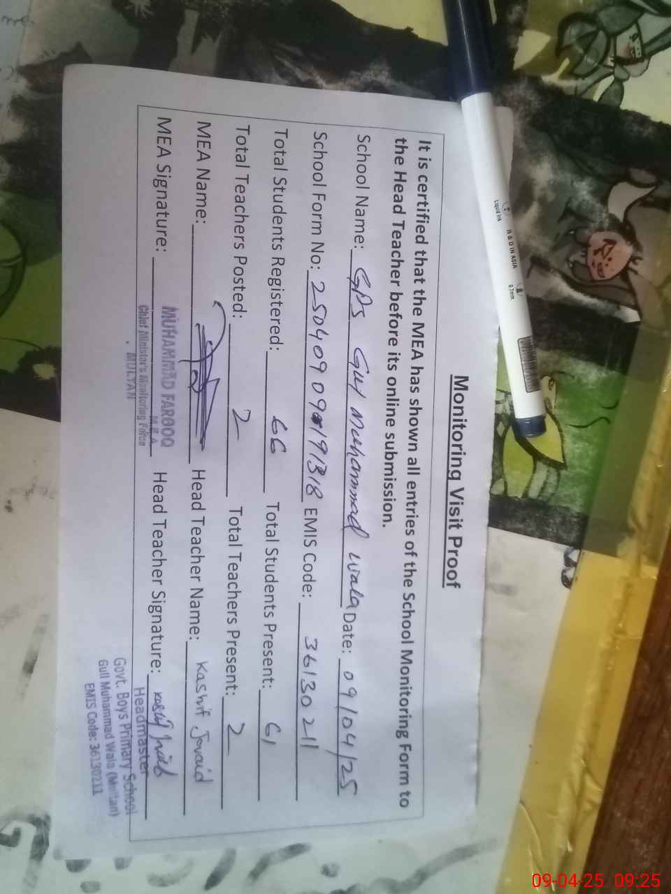 | Attendance Register | Head Teacher | MEA with School | Visit Proof |