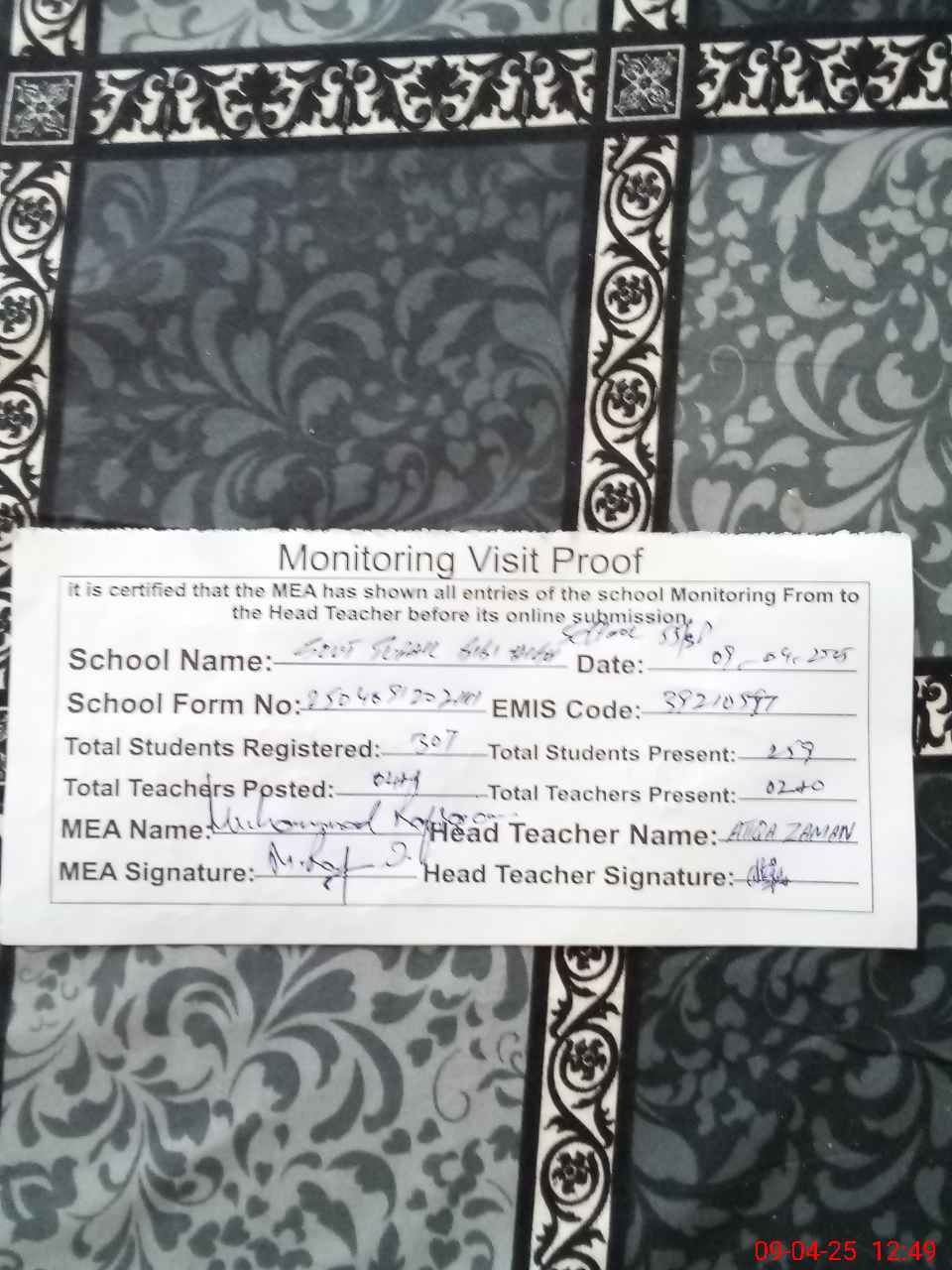 | Certified that this School was Inspected by the Undersigned MEA/DMO Today and the Information Stated Above is as Per Record. | |||||