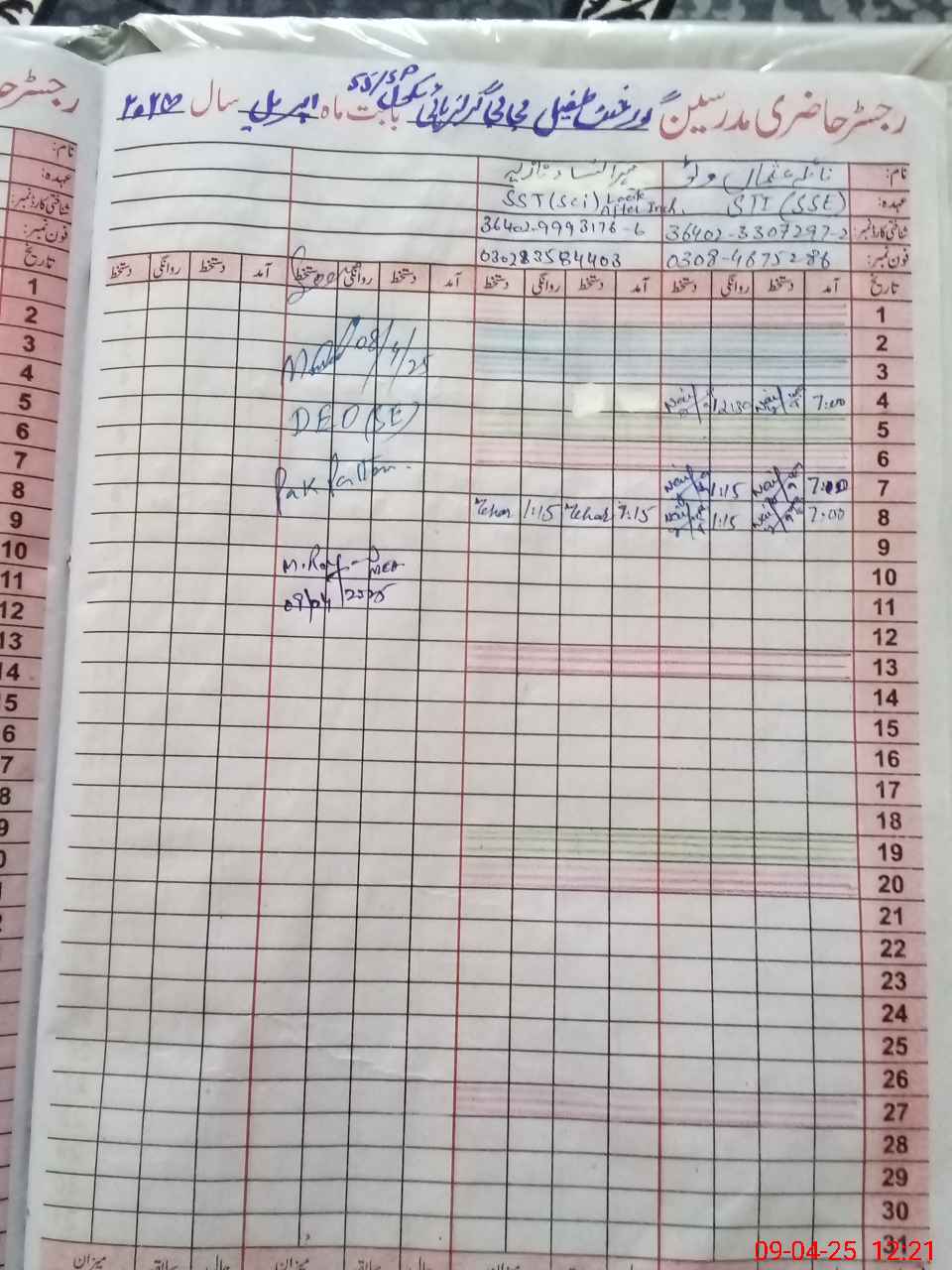 | Name: Fa**** BiBi Designation: (School Headmaster's/Headmistress's) PST Phone/Cell Number: 03**** |