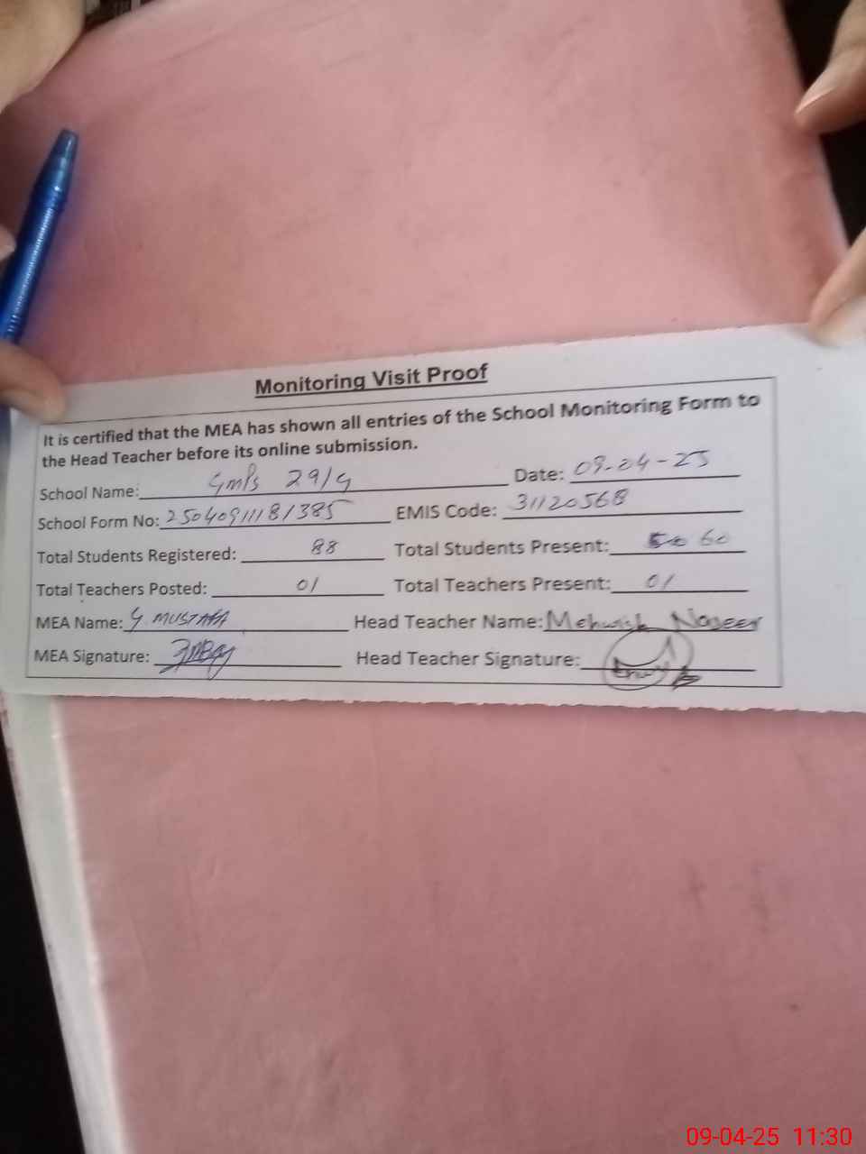 | Attendance Register | Head Teacher | MEA with School | Visit Proof |