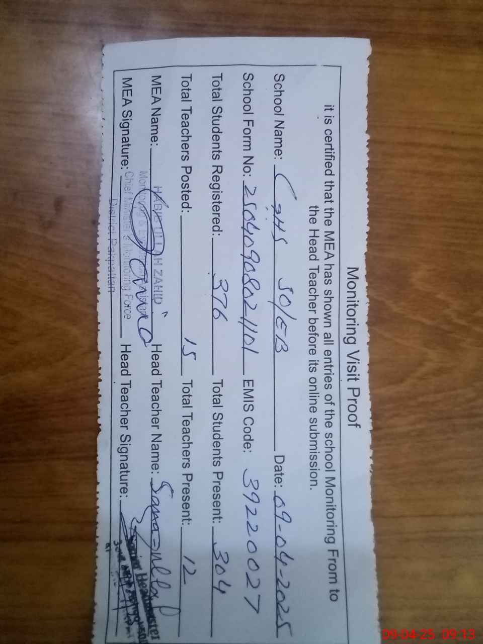 | Certified that this School was Inspected by the Undersigned MEA/DMO Today and the Information Stated Above is as Per Record. | |||||