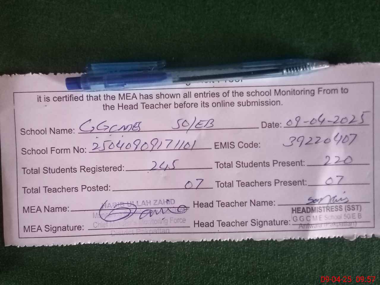 | Certified that this School was Inspected by the Undersigned MEA/DMO Today and the Information Stated Above is as Per Record. | |||||