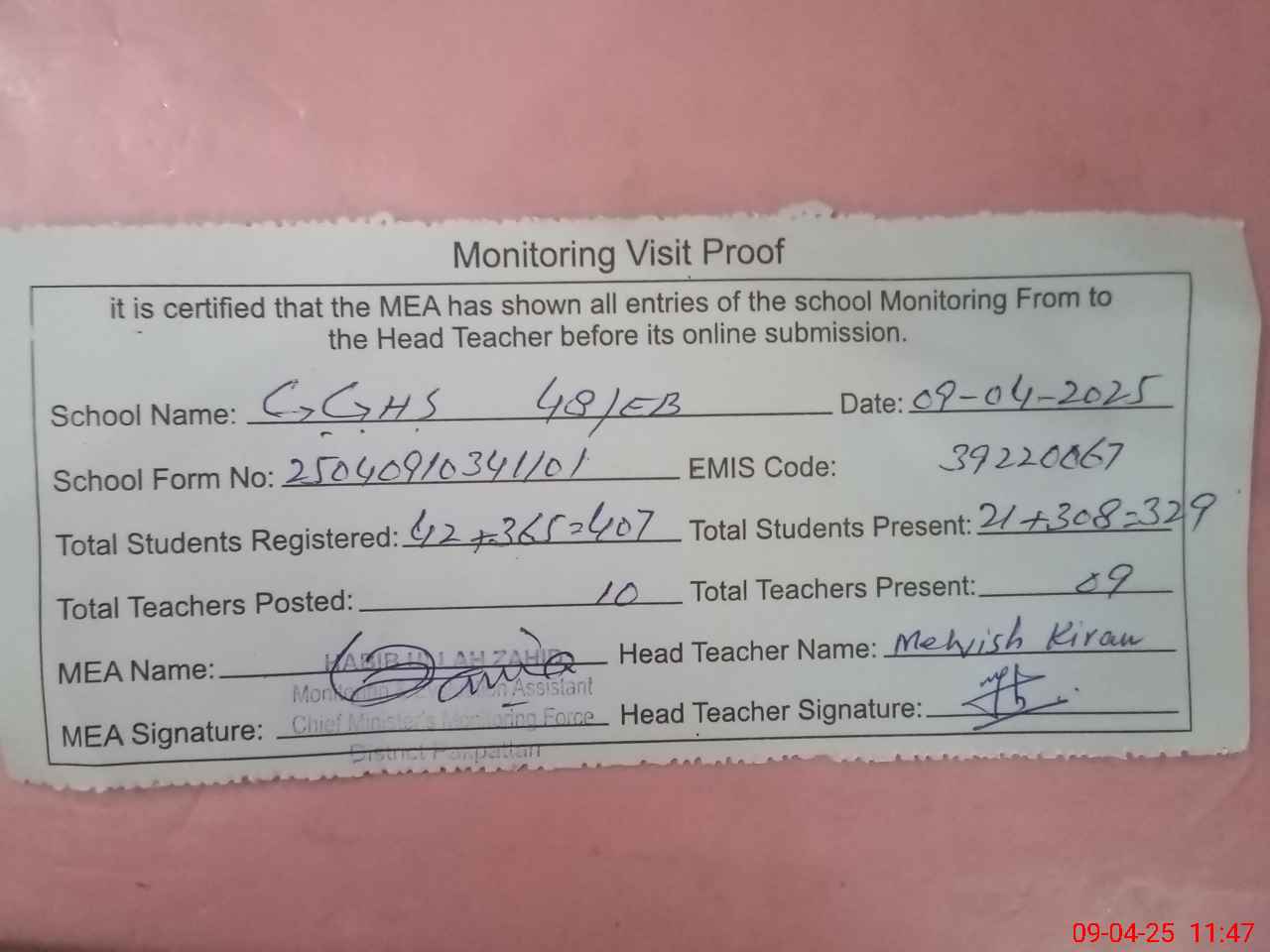 | Attendance Register | Head Teacher | MEA with School | Visit Proof |