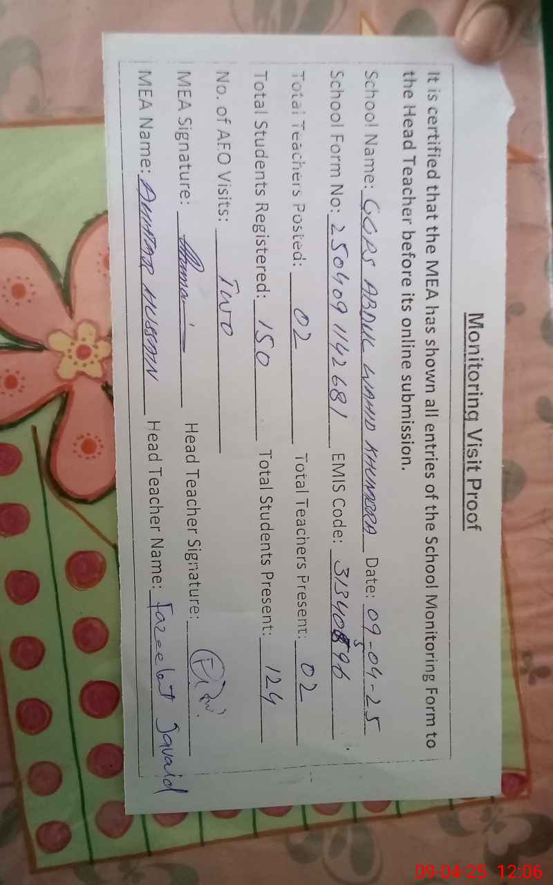 | EMIS Code: 31340596 | Name of School: GGPS ABDUL WAHID KHUMBHRA | |||