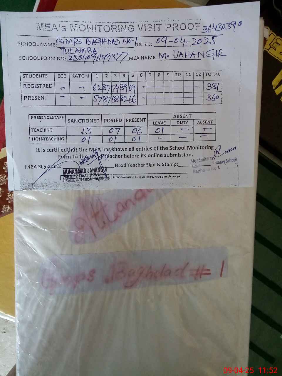 | Attendance Register | Head Teacher | MEA with School | Visit Proof |