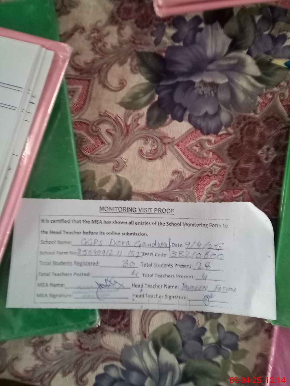 | Attendance Register | Head Teacher | MEA with School | Visit Proof |