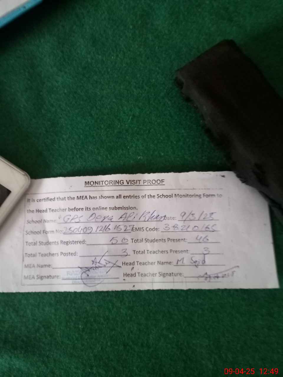 | Attendance Register | Head Teacher | MEA with School | Visit Proof |