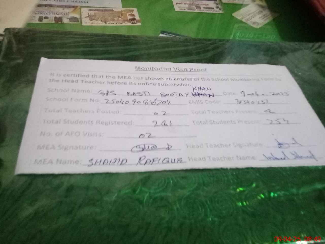 | Attendance Register | Head Teacher | MEA with School | Visit Proof |