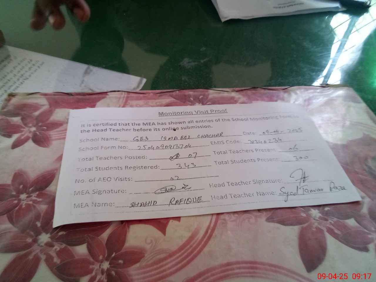 | Attendance Register | Head Teacher | MEA with School | Visit Proof |