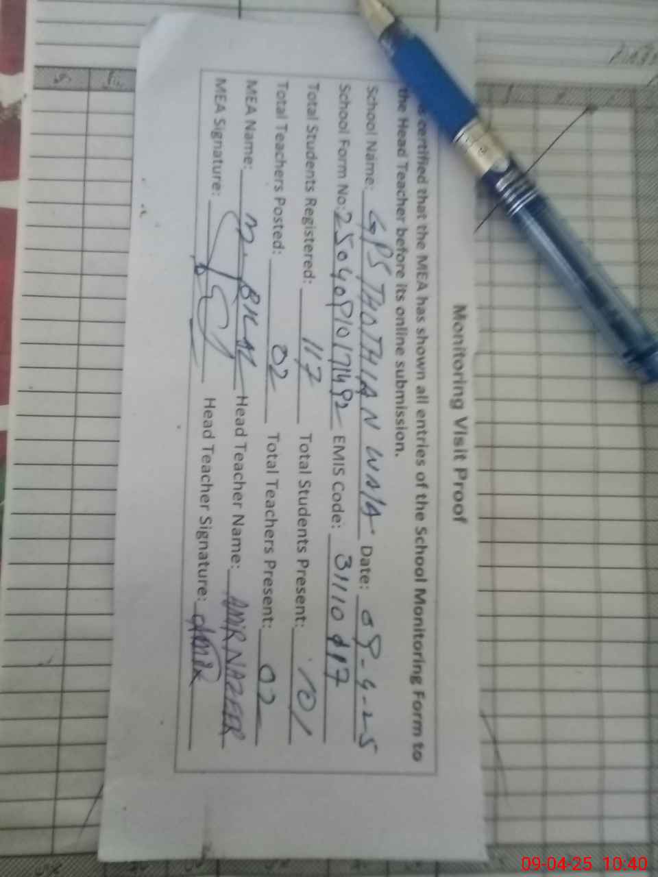 | Attendance Register | Head Teacher | MEA with School | Visit Proof |