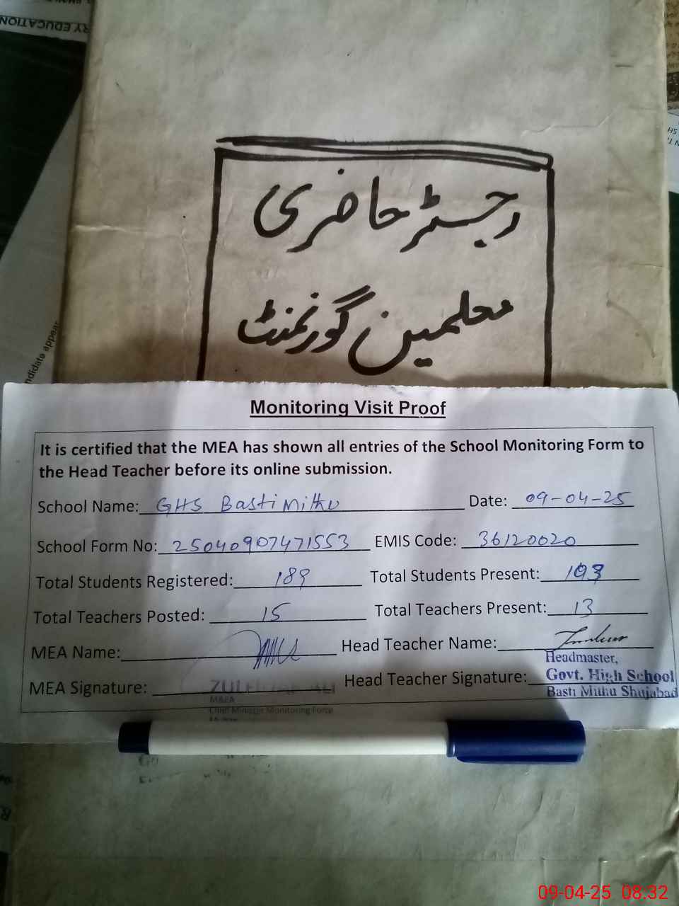 | Attendance Register | Head Teacher | MEA with School | Visit Proof |