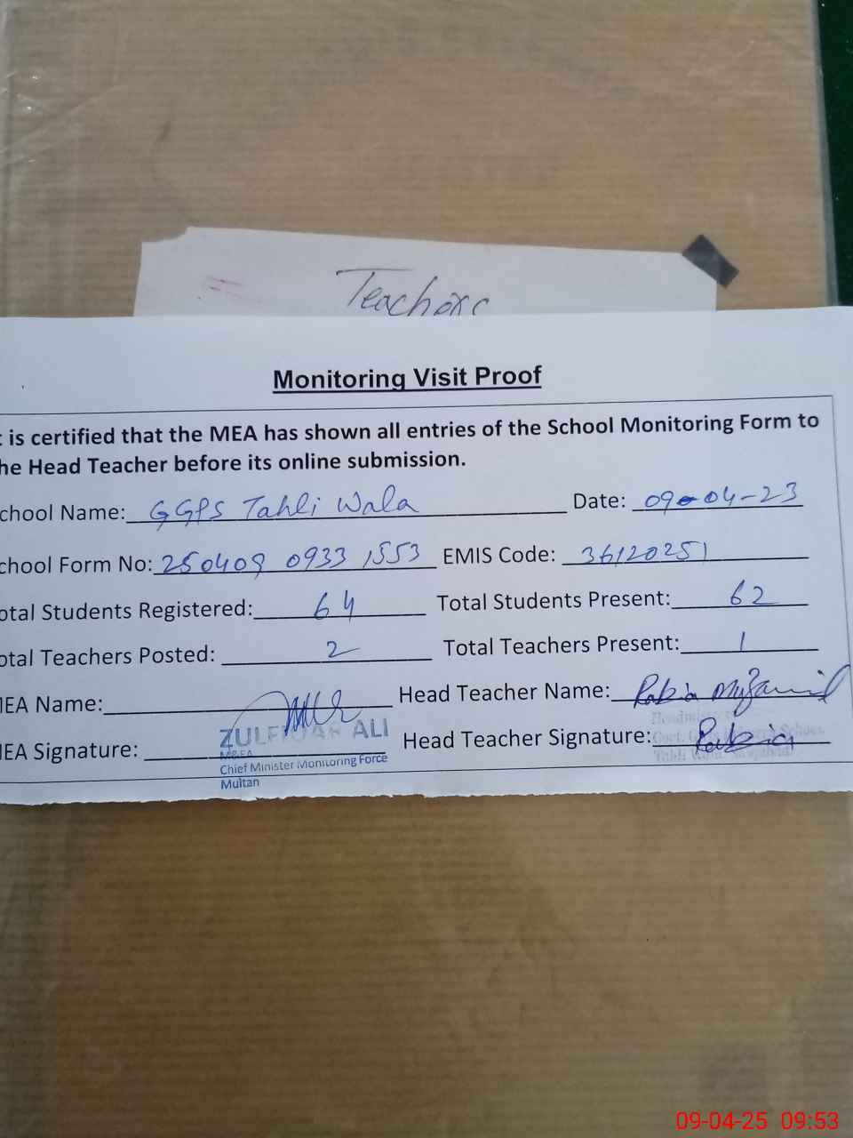 | Attendance Register | Head Teacher | MEA with School | Visit Proof |