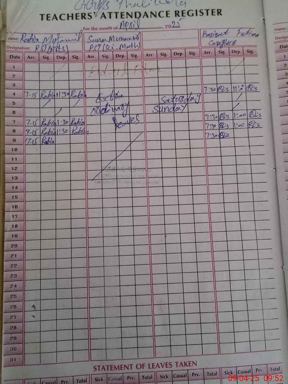 | Leave | Duty | Absent | Maternity | Medical | Ex- Pak |