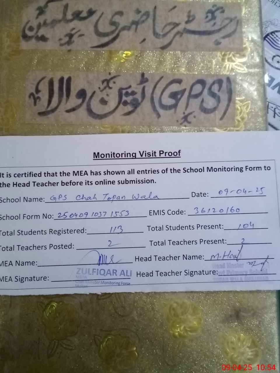 | EMIS Code: 36120160 | Name of School: GPS CHAH TOPAN WALA MUZA NASEER PUR | |||