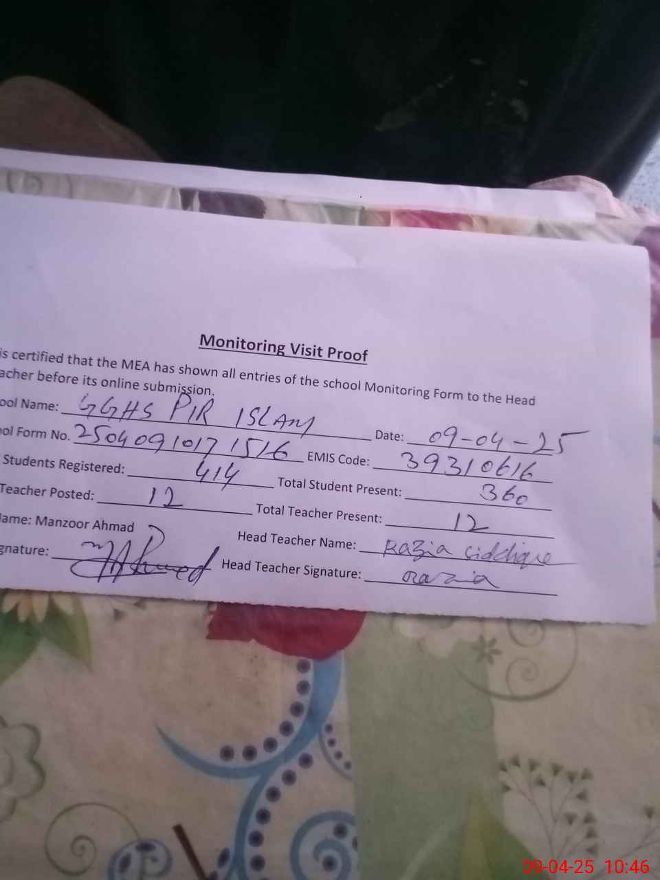 | Monitoring Date: 09-04-2025 | Start Time: 09-04-2025 10:16 AM | End Time: 09-04-2025 10:50 AM | Name of MEA: MA**** AH**** | |