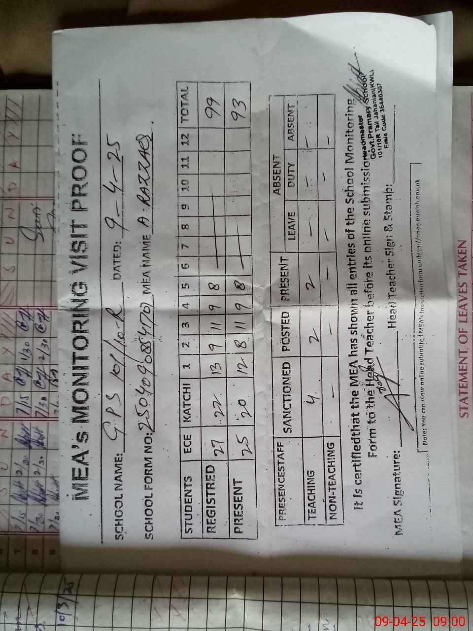 | Attendance Register | Head Teacher | MEA with School | Visit Proof |