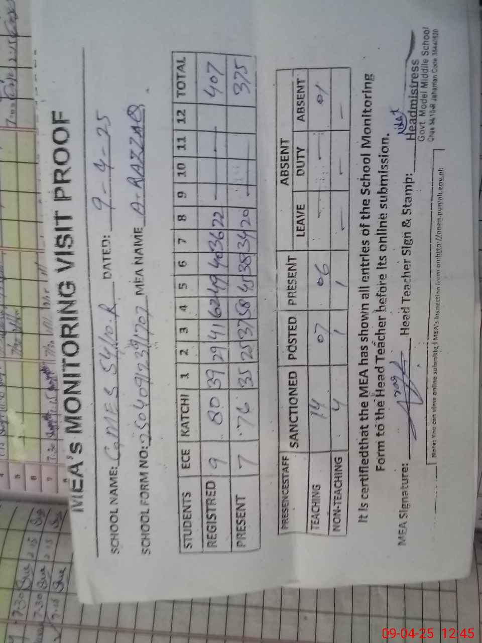 | Attendance Register | Head Teacher | MEA with School | Visit Proof |