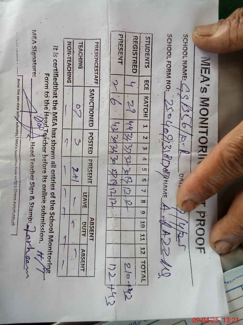| Attendance Register | Head Teacher | MEA with School | Visit Proof |