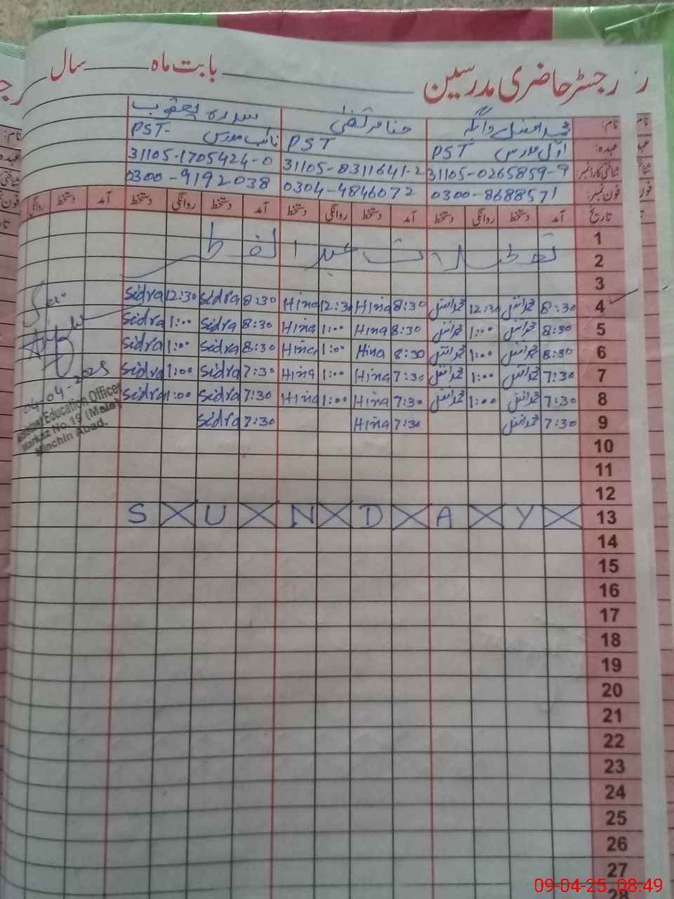| CNIC | Full Name | Designation | R/C | Absence During Last Calender Month |
