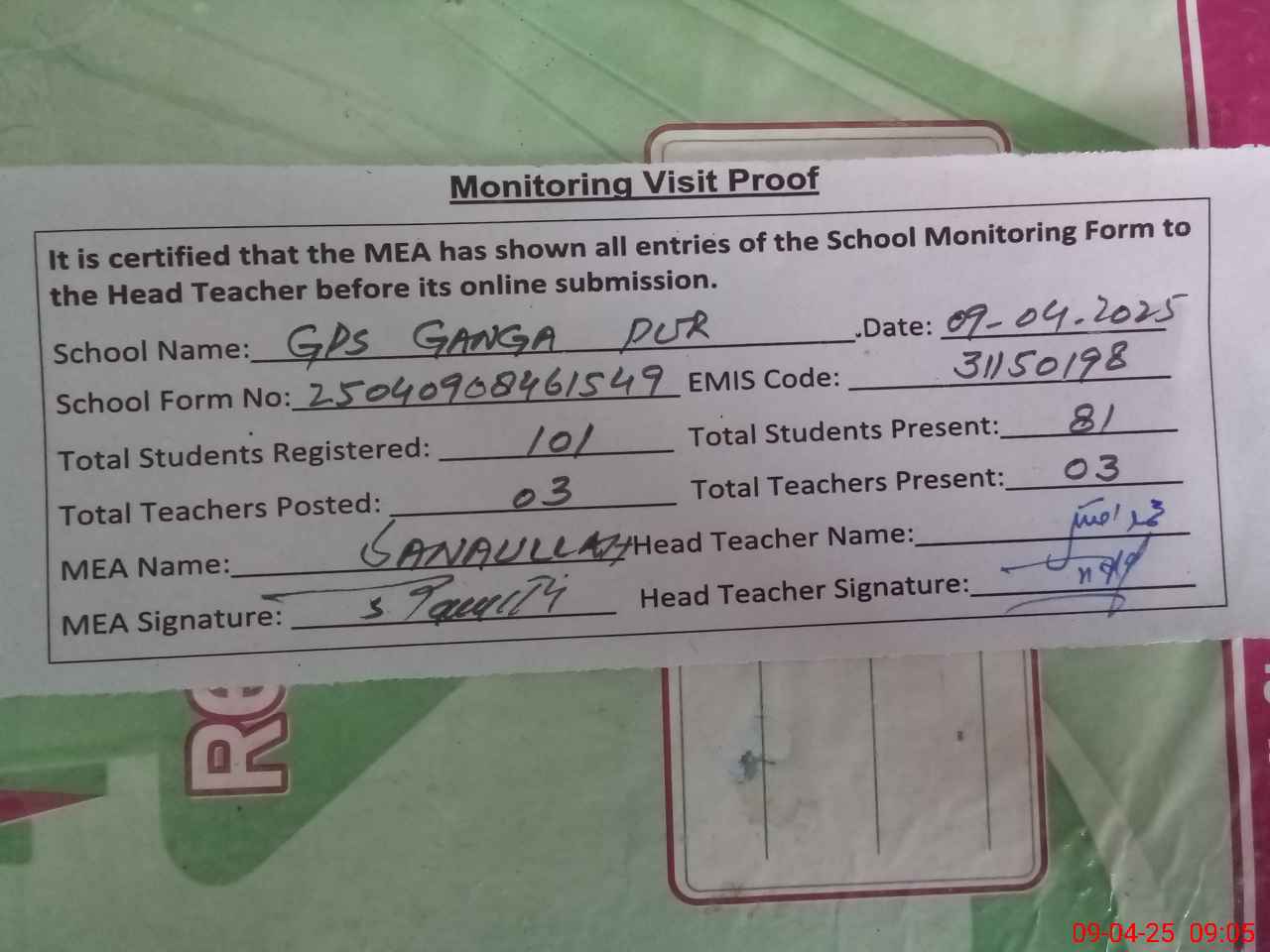 | Attendance Register | Head Teacher | MEA with School | Visit Proof |