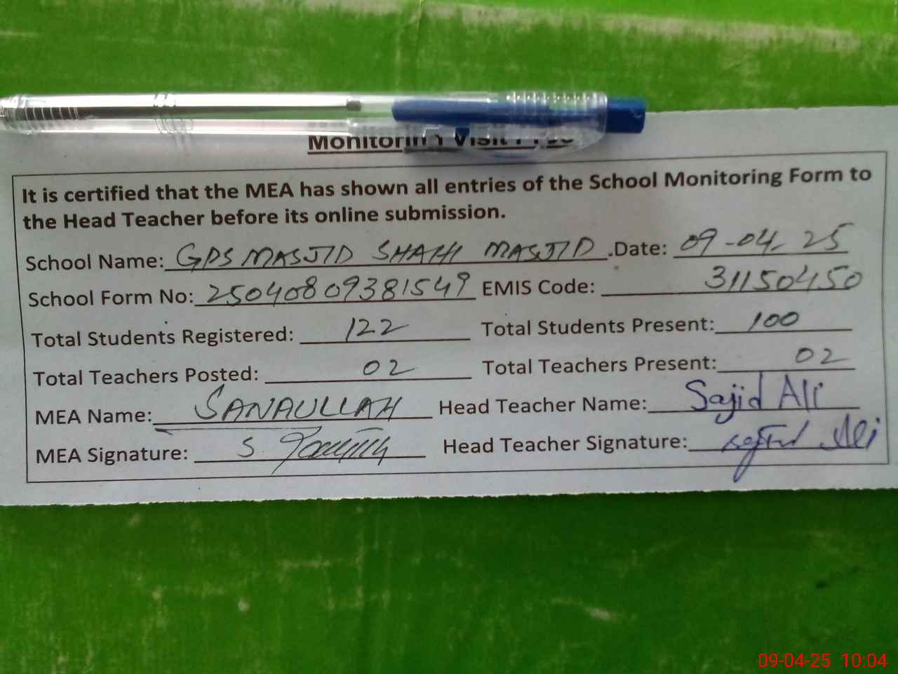 | Attendance Register | Head Teacher | MEA with School | Visit Proof |