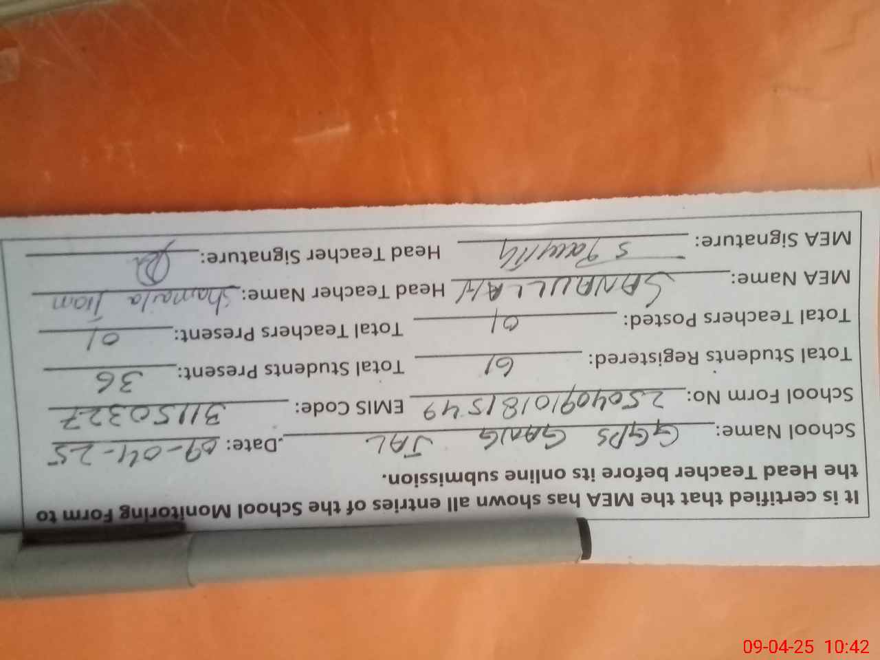 | Attendance Register | Head Teacher | MEA with School | Visit Proof |