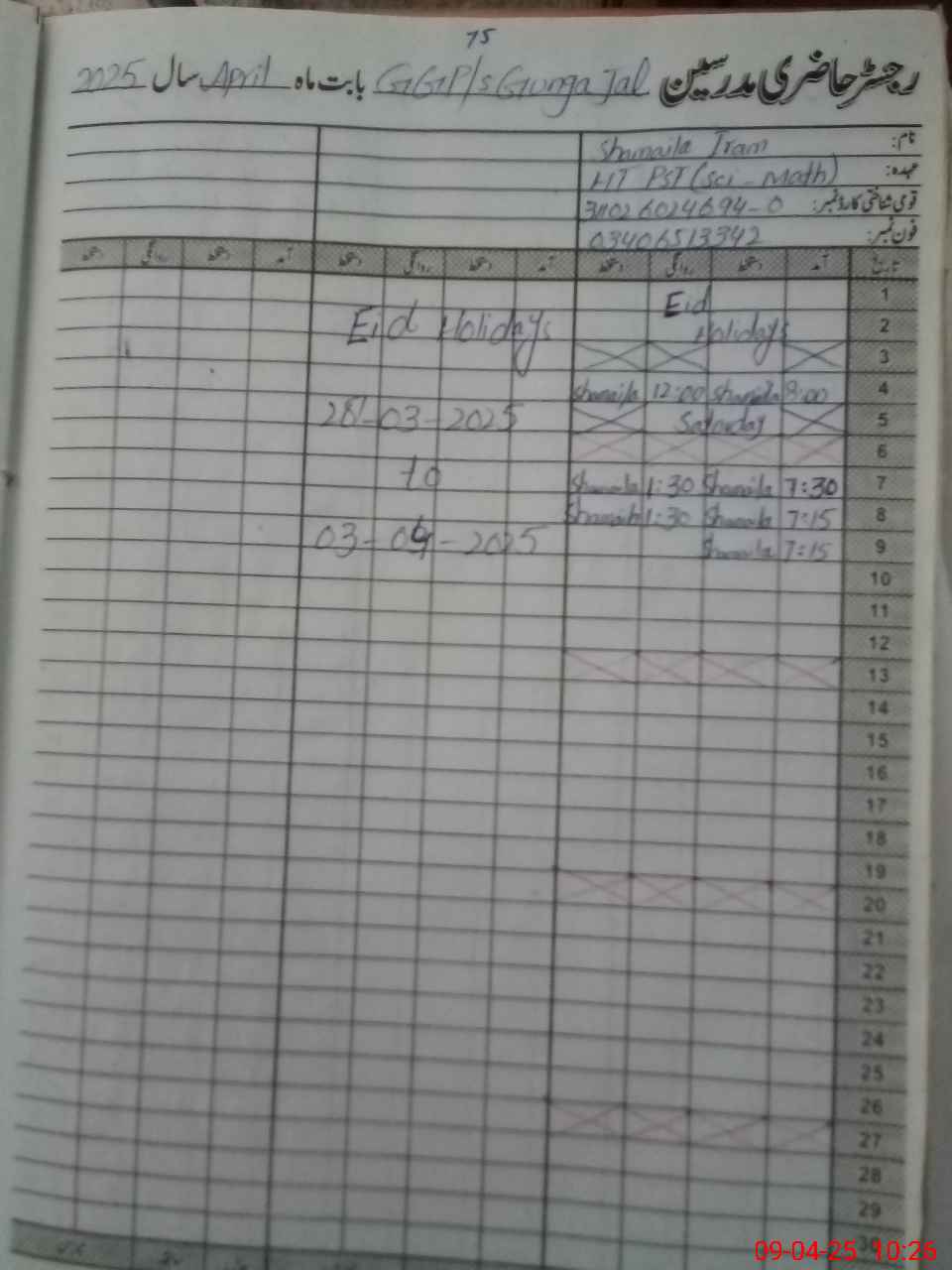 | Name: SH**** IR**** Designation: (School Headmaster's/Headmistress's) E S E ( Sci Math) Phone/Cell Number: 03**** |