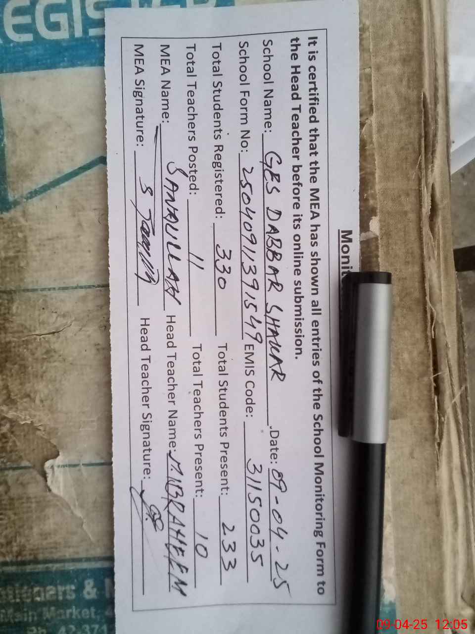 | Attendance Register | Head Teacher | MEA with School | Visit Proof |