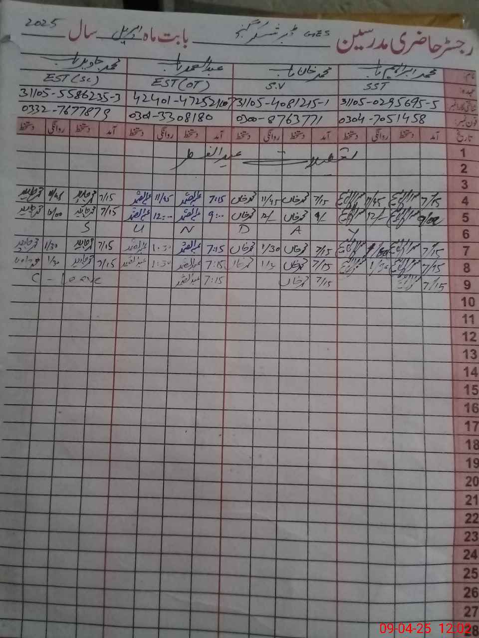 | CNIC | Full Name | Designation | R/C | Absence During Last Calender Month |