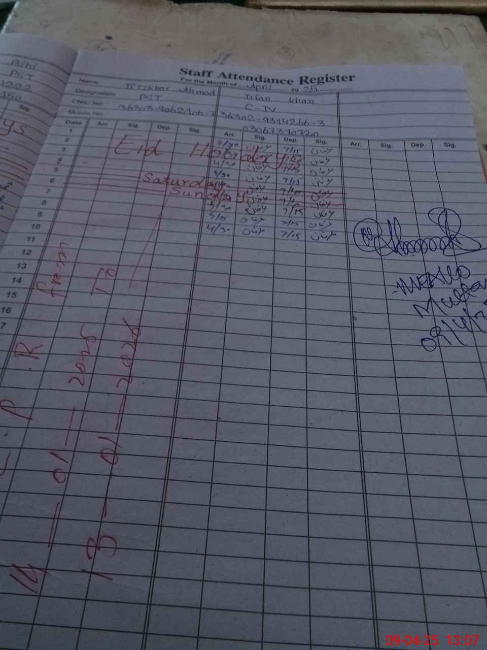 | CNIC | Full Name | Designation | R/C | Absence during last cal. month |