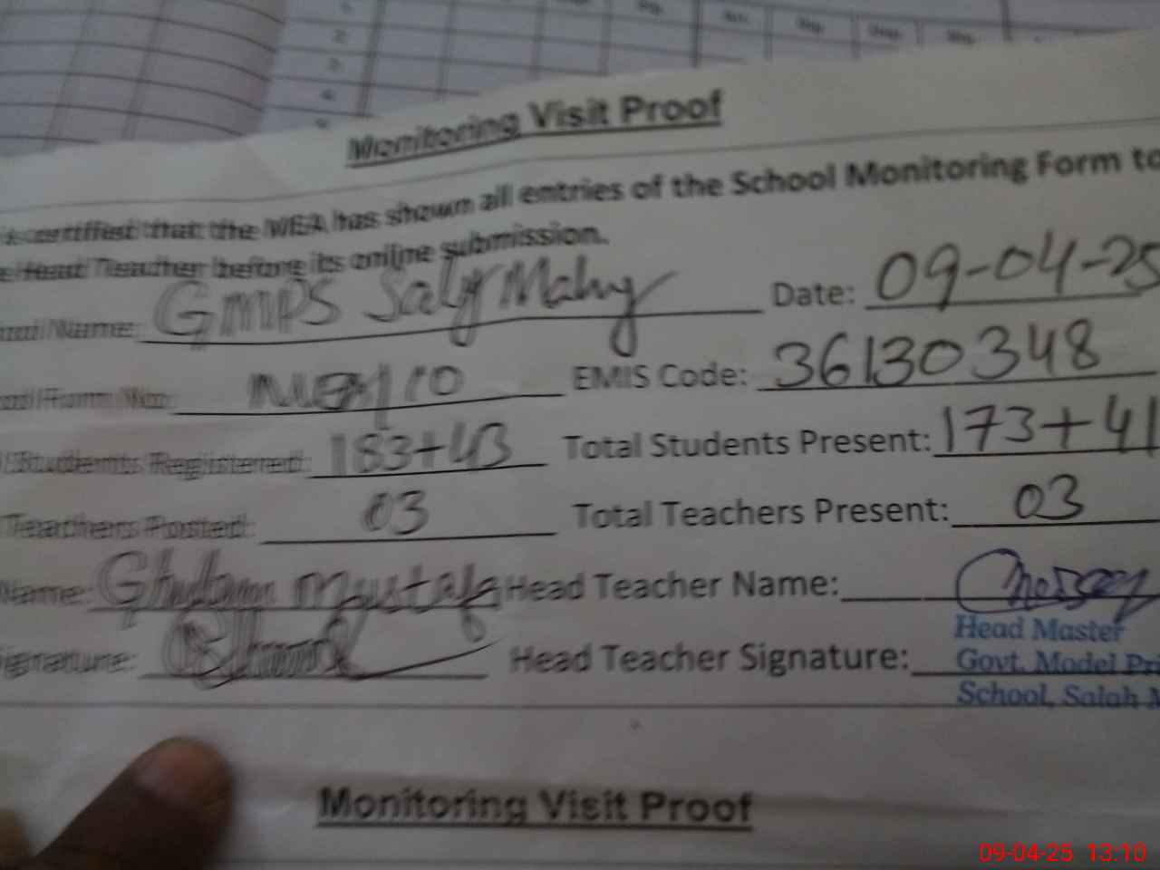 | Attendance Register | Head Teacher | MEA with School | Visit Proof |