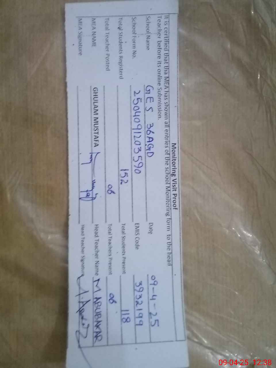 | Attendance Register | Head Teacher | MEA with School | Visit Proof |