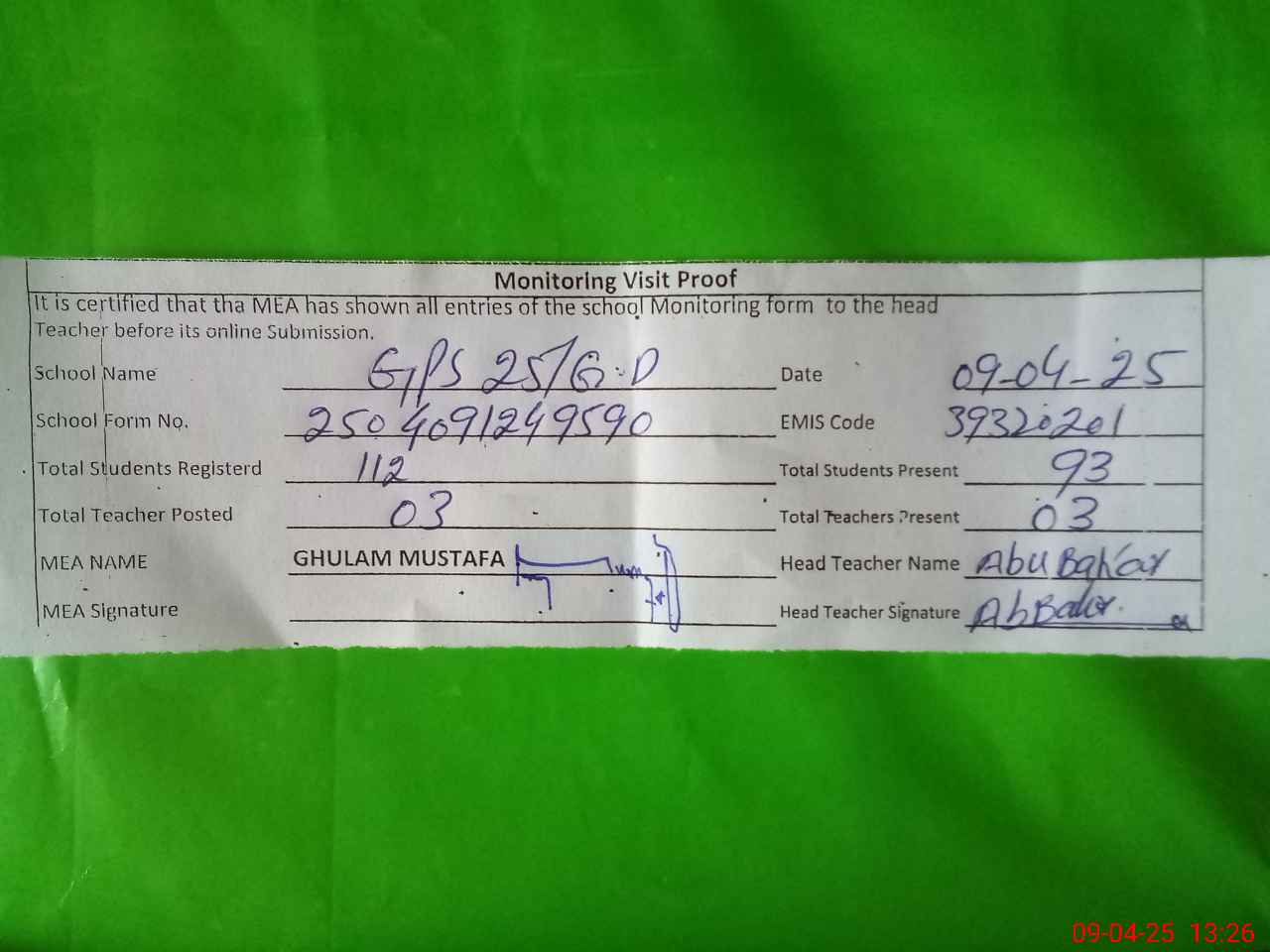 | EMIS Code: 39320201 | Name of School: GPS CHAK 25/G.D | |||
