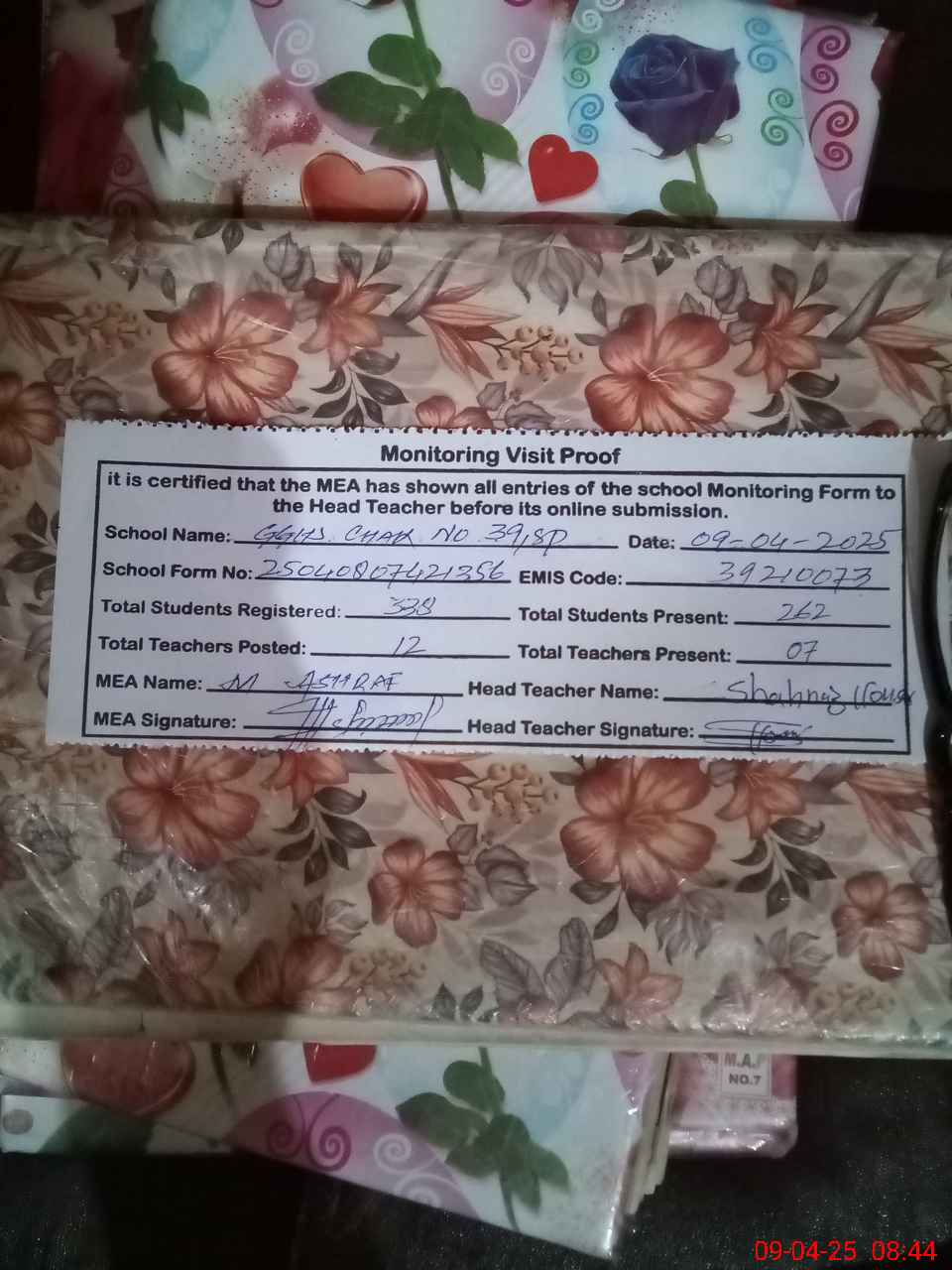 | EMIS Code: 39210073 | Name of School: GGHS CHAK NO.39 SP | |||
