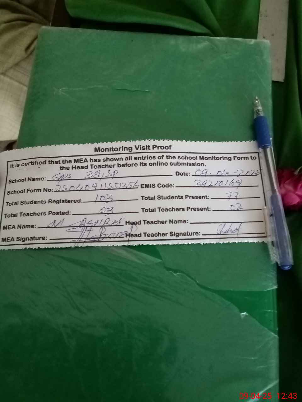 | Attendance Register | Head Teacher | MEA with School | Visit Proof |